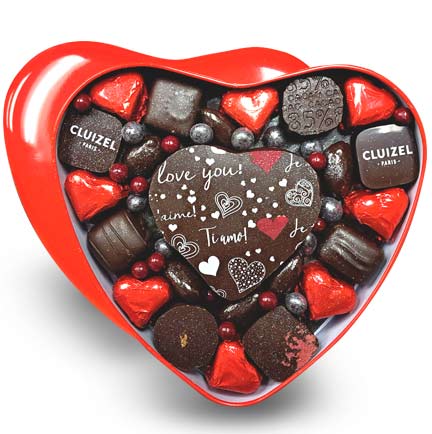 SayΒ "I love you!" with this beautiful Valentine's Chocolate heart-shaped tin, featuring a giant dark praline truffle, assorted dark truffles with chocolate-covered cocoa nibs, almonds, and cereal puffs.