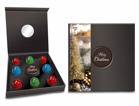 This enchanting Christmas Chocolate Gift Box features a dark chocolate plaque displaying, 'Merry Christmas' through a clear view window, including 8 handcrafted chocolate truffles: dark ganache with passion fruit, white chocolate Egg Nog with spices, dark ganache with raspberry, and hazelnut ganache.