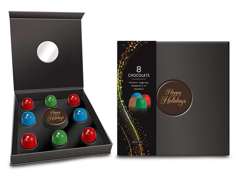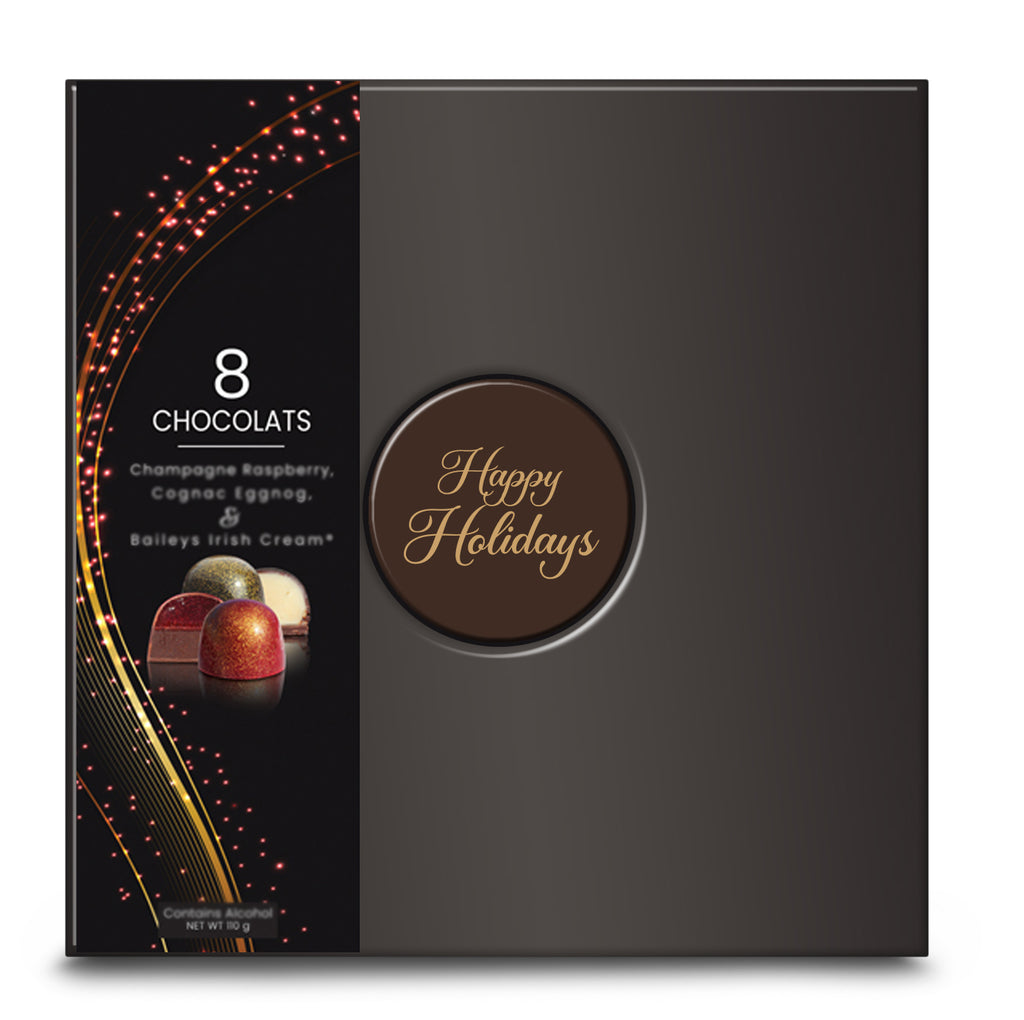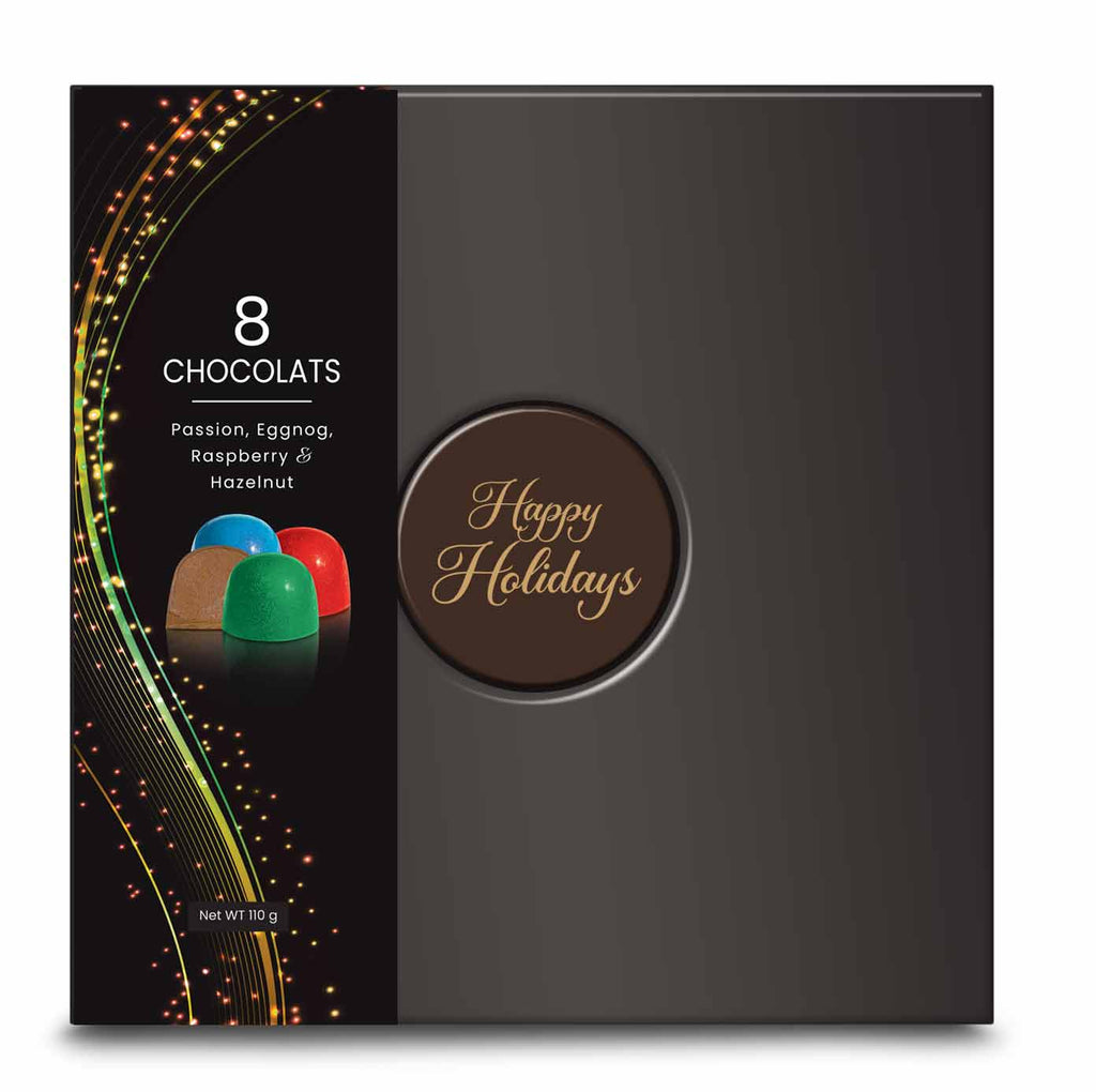 This enchanting Holiday Chocolate Gift Box features a dark chocolate plaque displaying 'Happy Holidays' through a clear view window, including 8 handcrafted chocolate truffles: dark ganache with passion fruit, white chocolate Egg Nog with spices, dark ganache with raspberry, and hazelnut ganache.